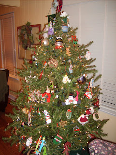 Center of the table. These ornaments are the favors from Lindsi & Derek's wedding. They donated to a charity in our name and gave us ornaments as a reminder.Funny story: one year Nana and Papa had all ceremic ornaments on their tree and it weighted it down so much that it fell over!